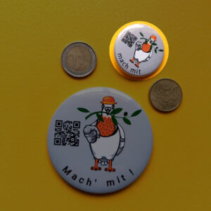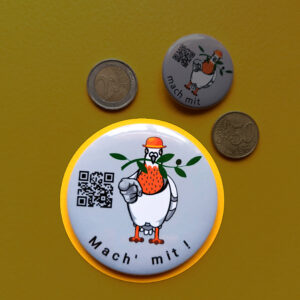 Das Wort „friedensZEUG“ beschreibt die Ausrüstung, mit der wir in den Frieden ziehen. Wir haben es erfunden, weil wir in der deutschen Sprache keine friedlichen Entsprechungen für Uniform, Abzeichen, Fahne oder Waffen gefunden haben.